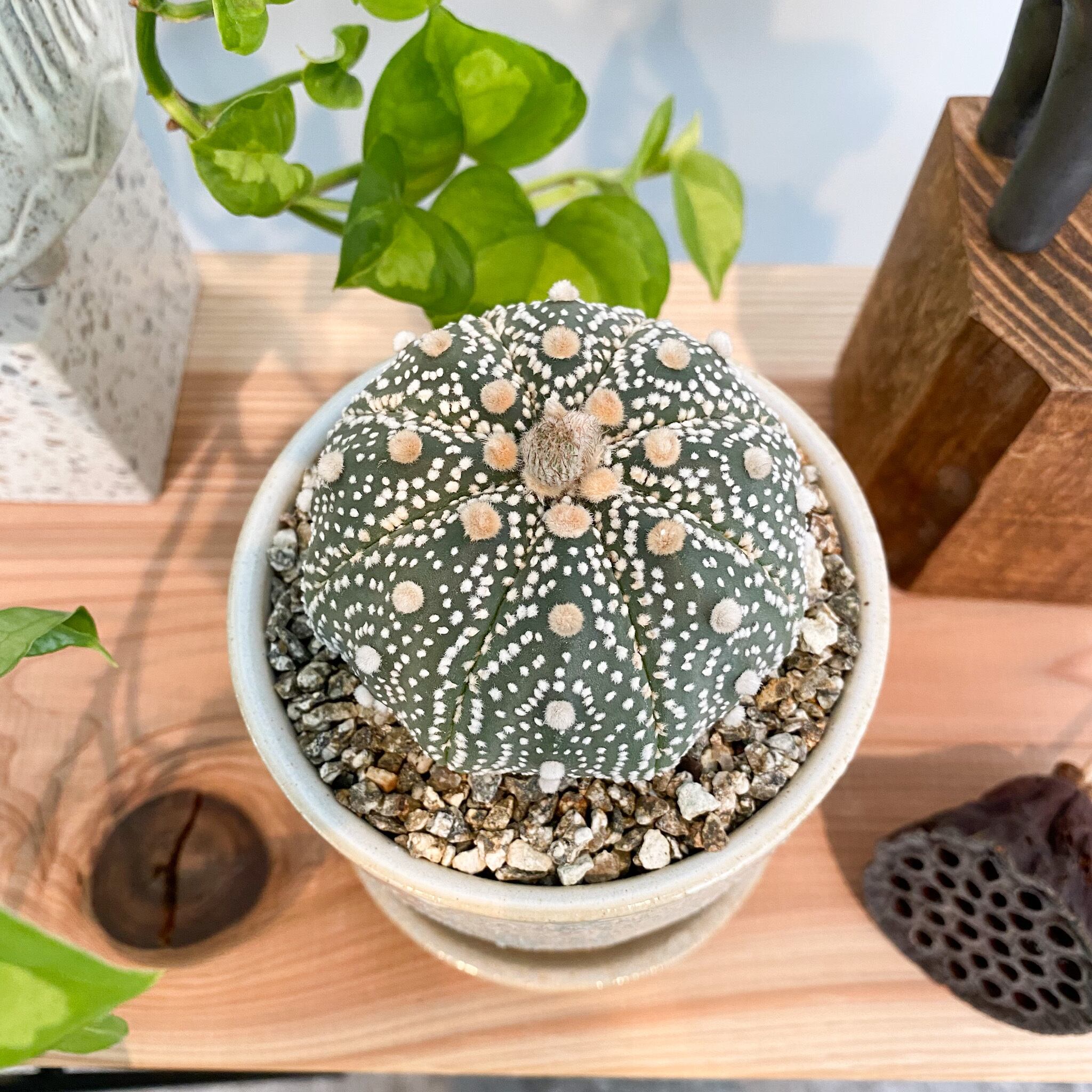 兜丸は、ウニのようなサイズ感と独特の「棘座(しざ=アレオーレ)」を持つ人気のサボテンです。種小名であるアステリアス(asterias)は「星のような」という意味をもち、肌には「星点」と呼ばれる白斑があります。