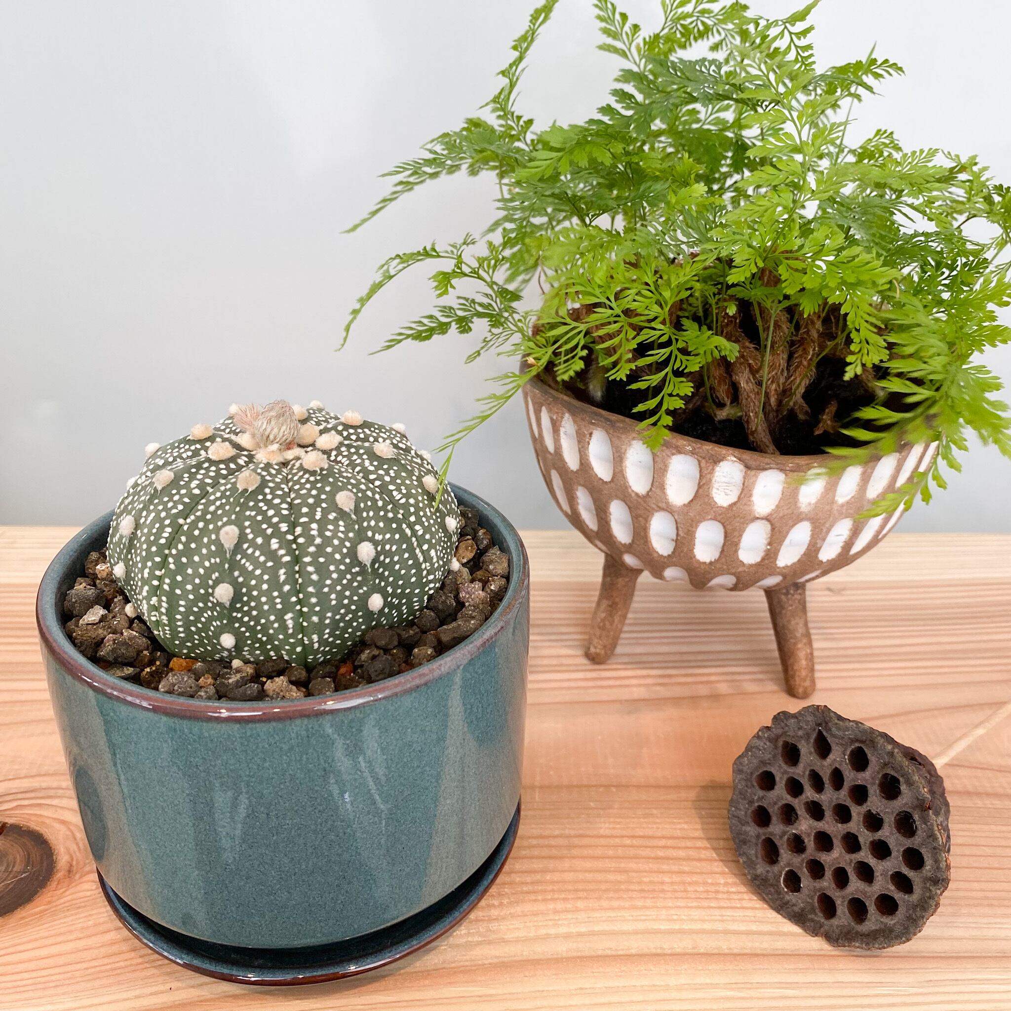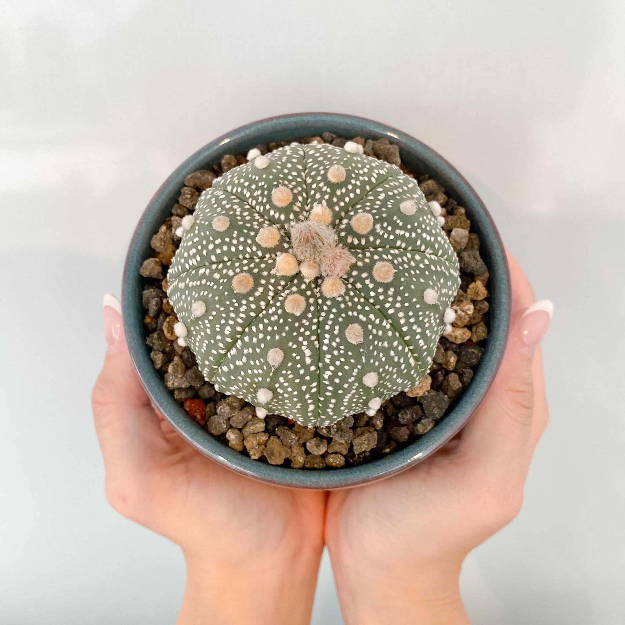 兜丸は、ウニのようなサイズ感と独特の「棘座(しざ=アレオーレ)」を持つ人気のサボテンです。種小名であるアステリアス(asterias)は「星のような」という意味をもち、肌には「星点」と呼ばれる白斑があります。