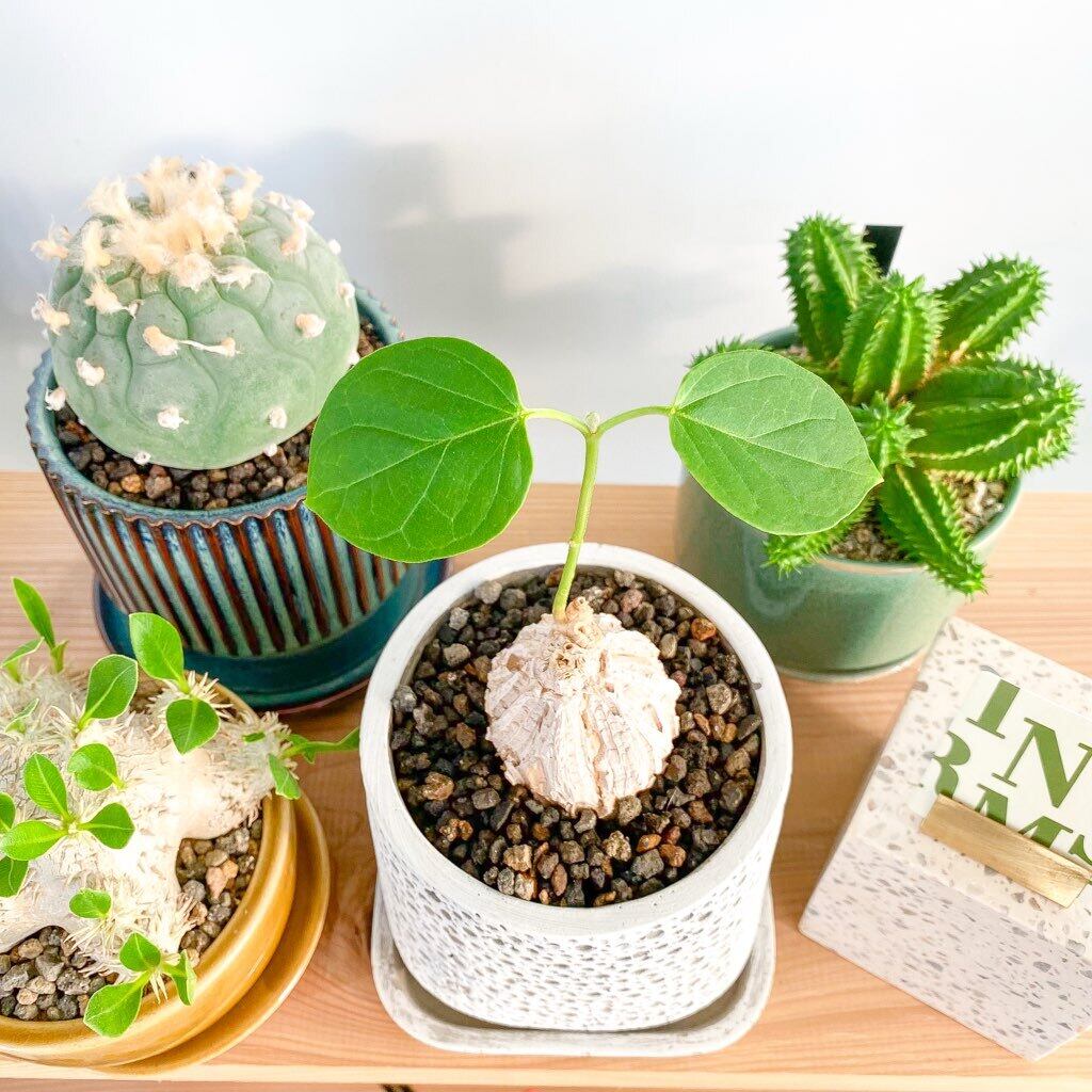 暖かくなってくると塊根からニョキニョキとツル状の枝を伸ばし始め、そこから葉っぱを展開していきます。
